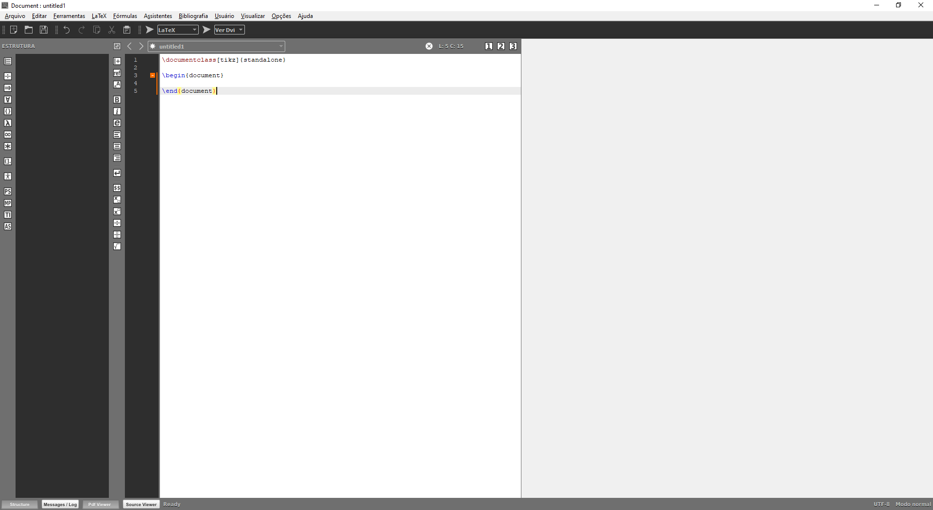 Vamos testar a funcionalidade de nossos programas. No Texmaker, crie um novo arquivo no menu “Arquivo” e digite nele a estrutura básica do programa LaTeX que será utilizado para criar as figuras em TikZ:
