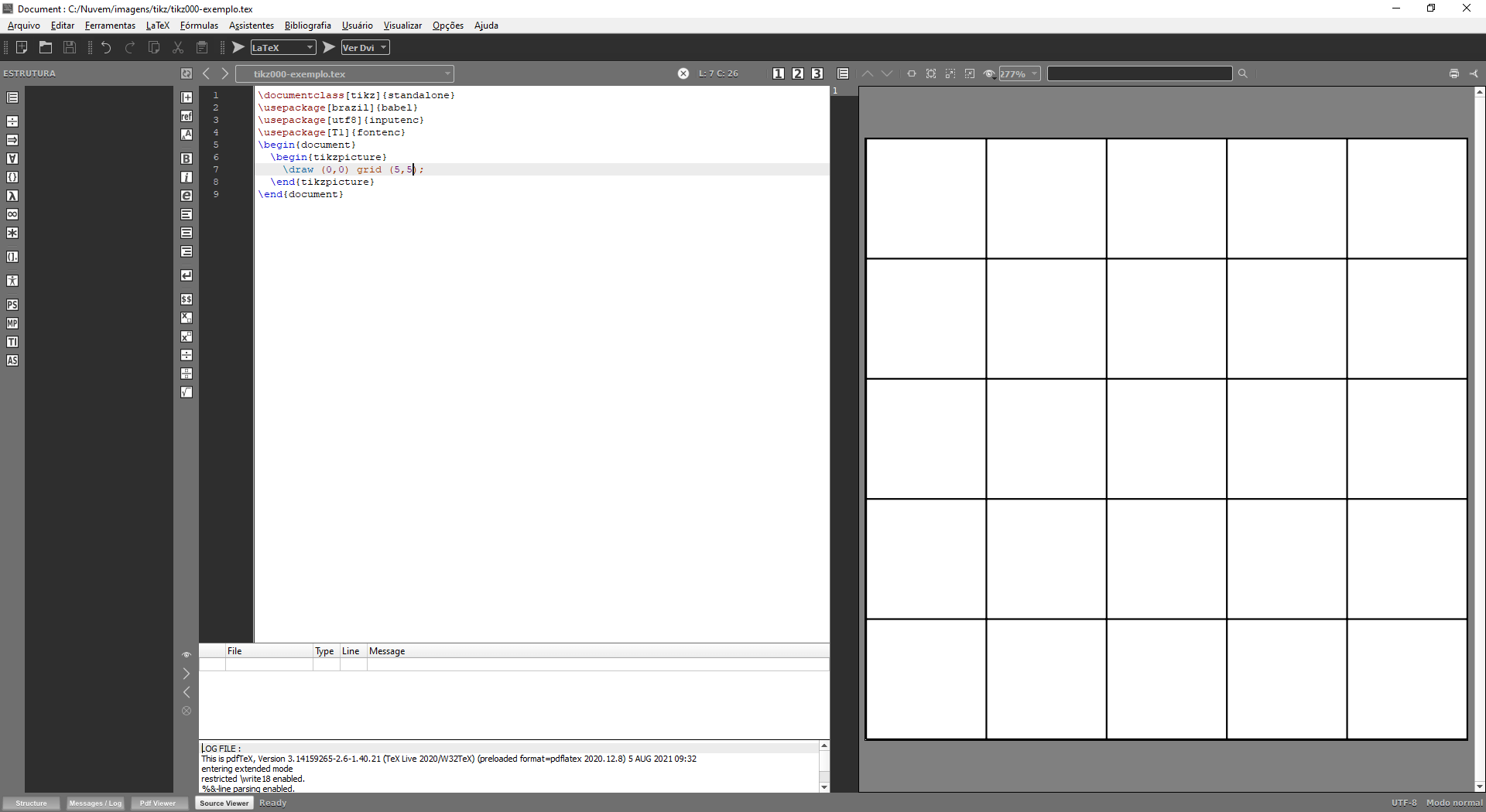 Um exemplo: vamos criar uma malha quadriculada que será extensamente utilizada em nossas ilustrações. Digite a linha \draw (0,0) grid (5,5); dentro do bloco tikzpicture: