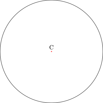 O único texto de nossa ilustração é a letra C, indicando o centro da circunferência. Do ponto de vista da TikZ, essa letra é um pequeno desenho, como um carimbo, que será localizado também com centro em algum ponto.