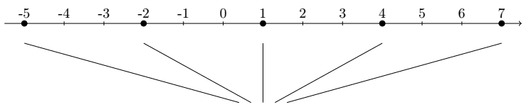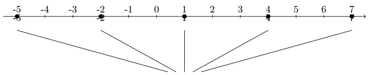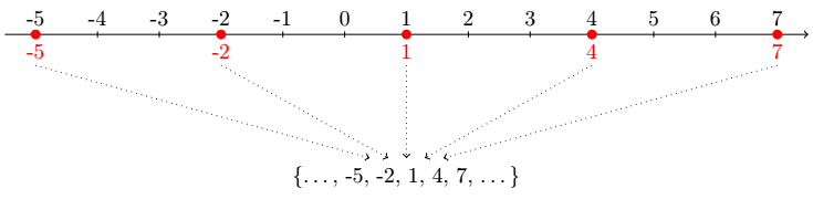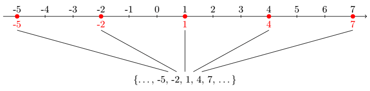 \draw (1, -2.3) node {\{\ldots, -5, -2, 1, 4, 7, \ldots\}};